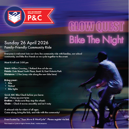 Everyone is welcome to join our family‑friendly community bike ride as we roll together to Glow Quest: Bike the Night!