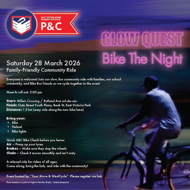 - GLOW QUEST: Bike the Night is a community ride on Saturday, 28 March. Everyone is welcome to join at Miller’s Crossing at 3pm. Please check the P&C page for more details.